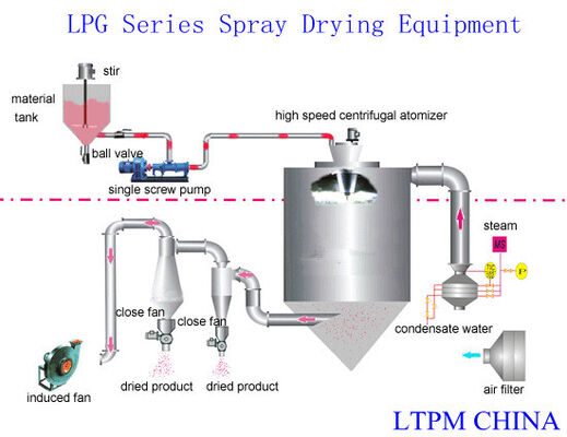 อากาศผ่านตัวกรองและเครื่องทำความร้อน ตัวจ่ายอากาศที่เข้าสู่ด้านบนของตัวเติม อากาศร้อนจะอยู่ในรูปของเกลียวและเข้าสู่ตัวเติมอย่างสม่ำเสมอวัสดุของเหลว จากรางของเหลวของวัสดุจากสิ่งที่ขัดแย้งกับชุมชนหรือเครื่องฉีดน้ำแบบผู้นำสำหรับด้านบนของปั๊มเฉพาะที่ส่งผ่านตัวกรอง ทำให้ของเหลวของวัสดุพุ่งออกมาเป็นหยดความร้อนขนาดเล็กมาก ของเหลวของวัสดุ และการไหลของอากาศร้อน และติดต่อกันความชื้นจะระเหยอย่างรวดเร็วภายในระยะเวลาอันสั้นมากจนกลายเป็นผลิตภัณฑ์สำเร็จรูปการปล่อยผลิตภัณฑ์สำเร็จรูปโดยด้านล่างของหอแห้งและเครื่องแยกลมกรดก๊าซเสียจะถูกระบายออกโดยเครื่องเป่าลม